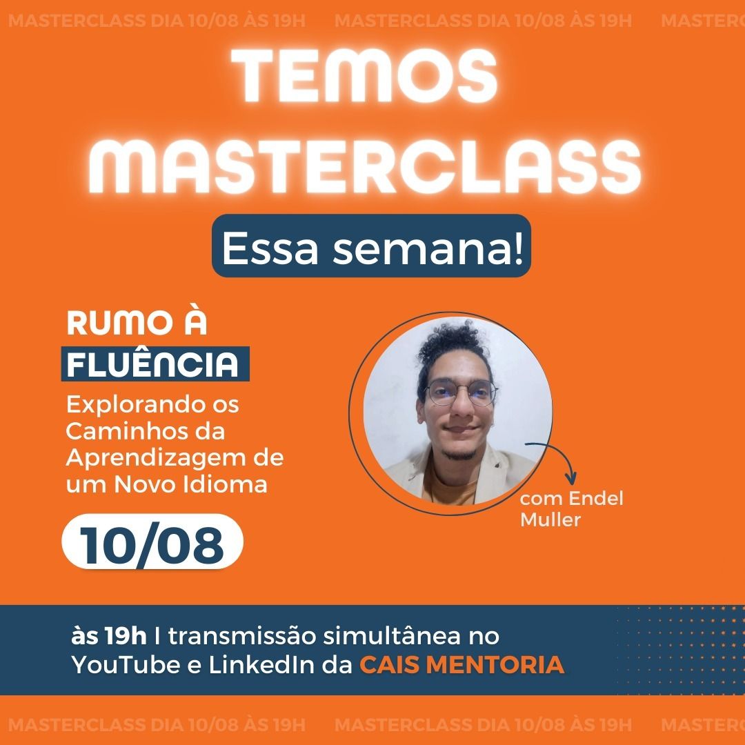 Hoje, dia 10/08 às 19h, a Cais Mentoria tem a honra de convidá-lo para participar de nossa Masterclass ao vivo no YouTube e no LinkedIn - "Rumo à Fluência - Explorando os Caminhos da Aprendizagem de um Novo Idioma".